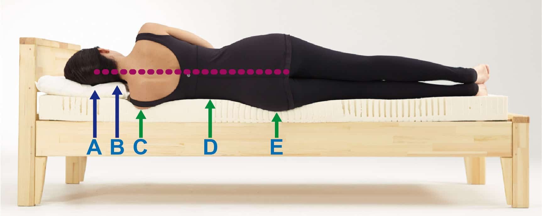 仰向き寝は背骨のS字カーブを正しい姿勢で支えることが必要です。下図のようにC,D,Eの支えがポイントです。A,Bは枕ですが、先に背骨のC,D,Eを調整してからでないと、枕だけ調整しても限界があります。