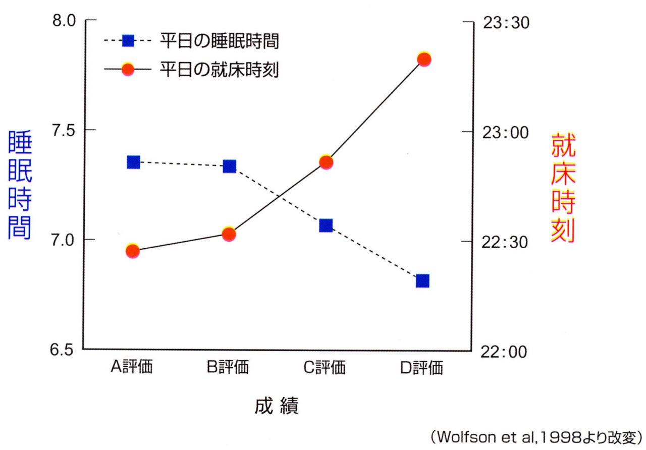 2002 年の学術会議報告書に,アメリカの高校生のデータ(平日の睡眠習慣と学業成績との関係)が引用されています。