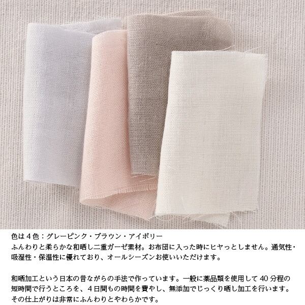 ふんわりと柔らかな和晒し二重ガーゼ素材。お布団に入った時にヒヤっとしません。通気性・吸湿性・保温性に優れており、オールシーズンお使いいただけます。