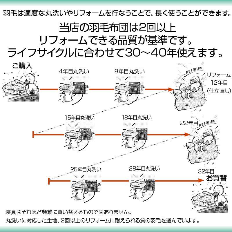 ※羽毛布団は基本受注生産です。縫い上がり側生地のある場合は、ご注文から1〜2週間でのお届けとなります。縫い上がり生地のない場合は、3〜4週間程度でのお届けとなります。お急ぎの方はお問い合わせください。