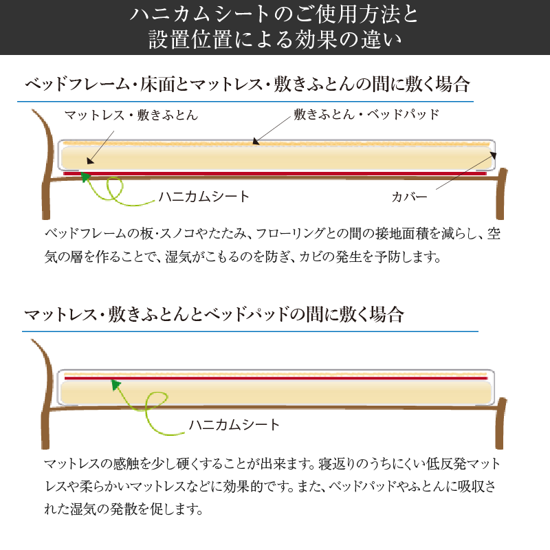 メッシュ状の立体構造で中に空気を含むことのできるシートです。暑さ対策、カビ予防、敷寝具の硬さ調整と多くの使い方ができます。