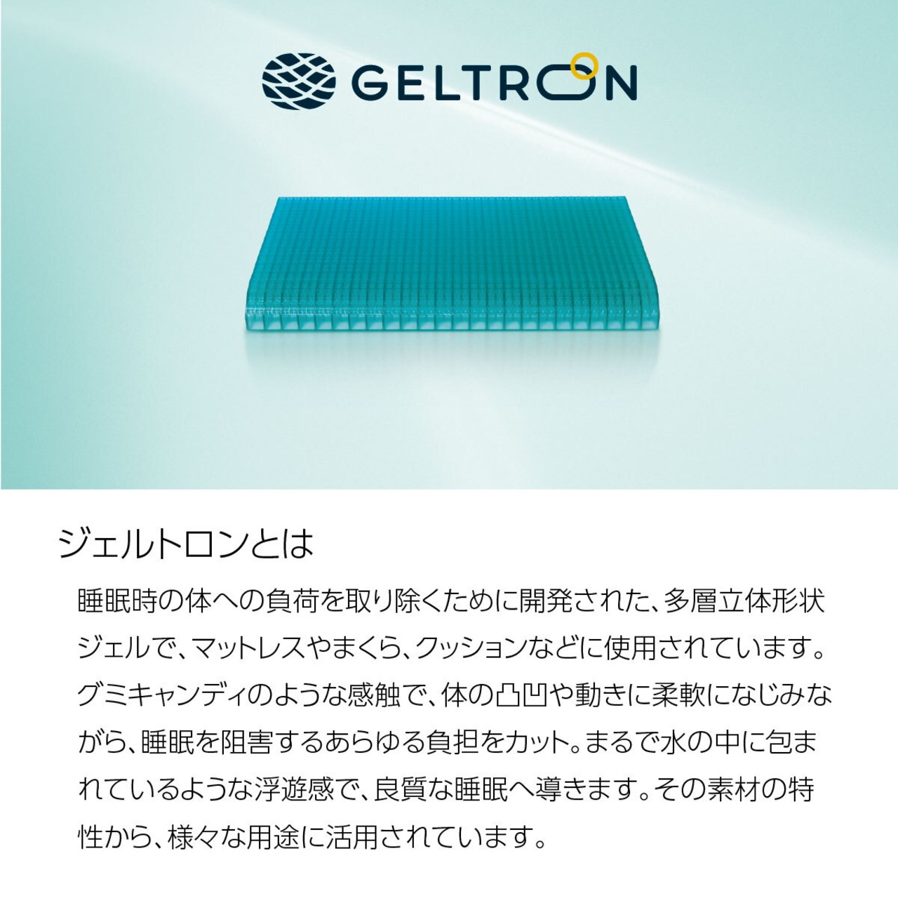 睡眠時の体への負荷を取り除くために開発された、多層立体形状ジェルで、マットレスやまくら、クッションなどに使用されています。