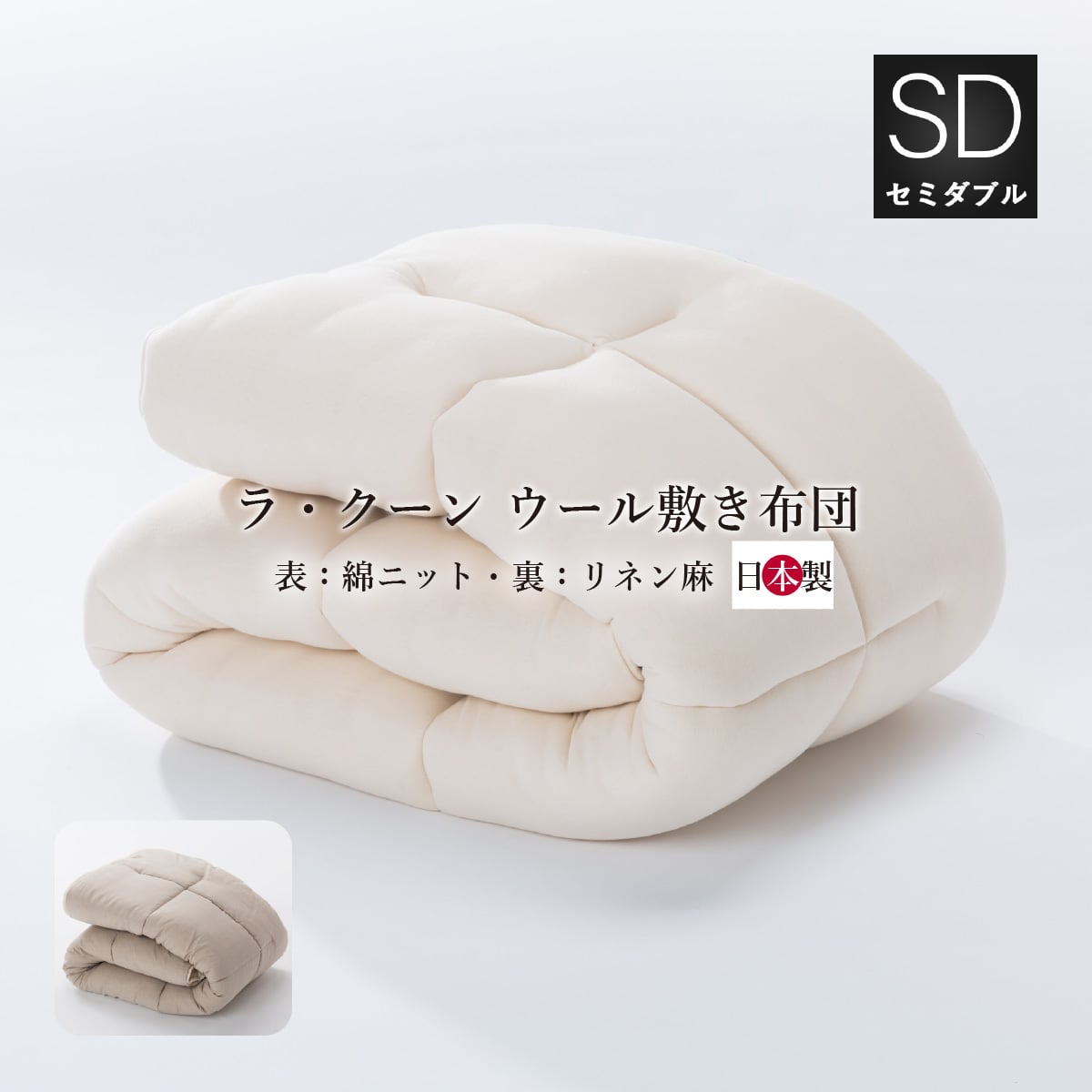 Sawadaオリジナル 羊毛わた100% ベッドパッド リネン麻付き 厚手 敷き布団 タイプ セミダブル 2枚敷き用 日本製 高品質ラ・クーン種ウール使用